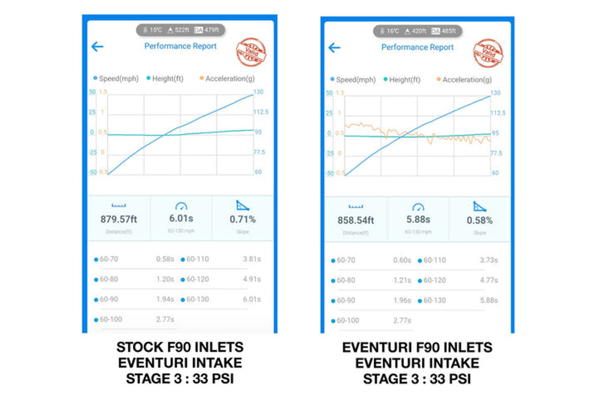 The intake was tested on the road using Dragy to record the acceleration from 60-130mph . Testing was carried out on the same stretch of road and on the same day to keep the variables minimum. Results show that with just the inlets added the acceleration times from 60-130mph reduced by 0.12 seconds which is a significant improvement at such speeds.(See images)