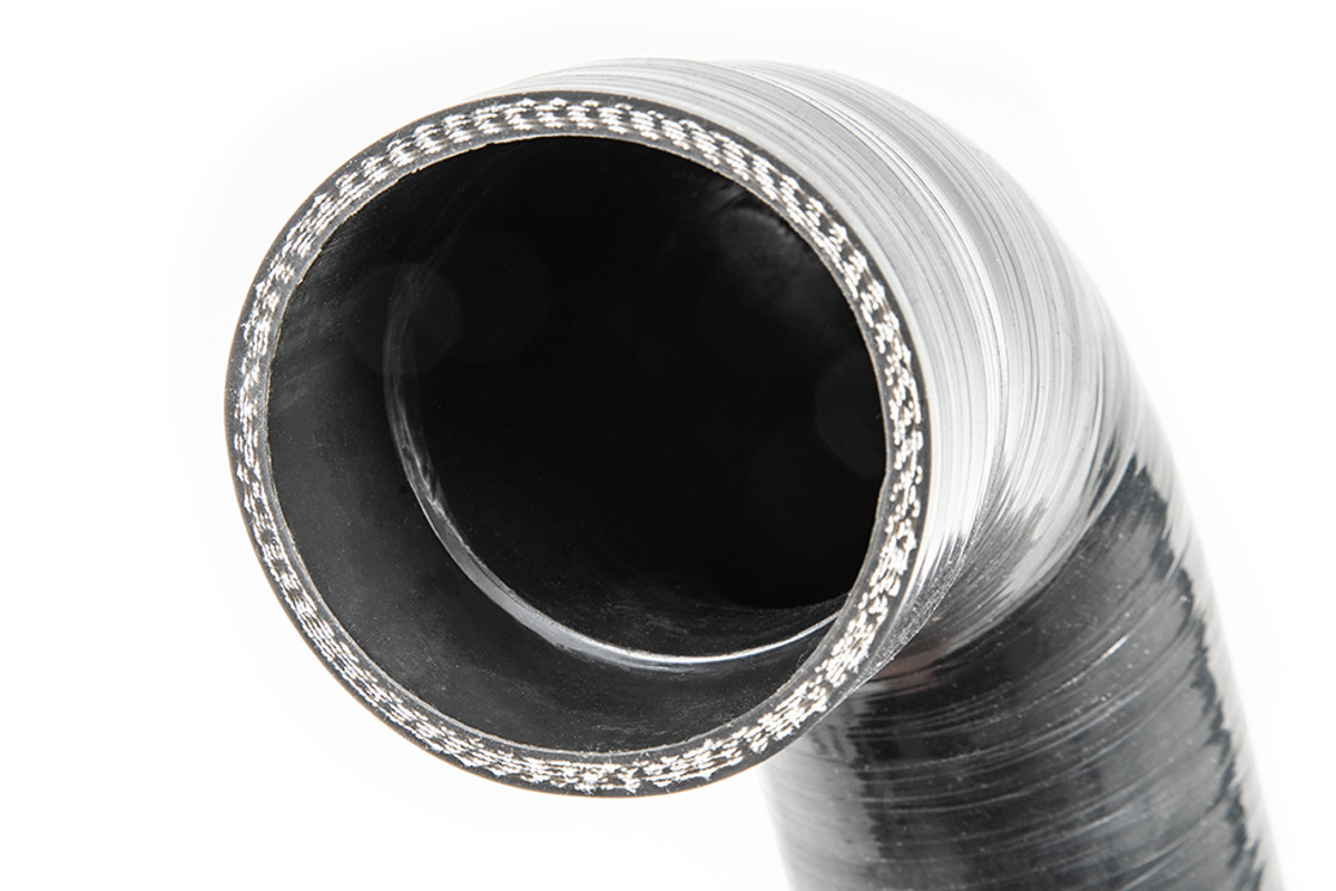 With an increase in inlet and outlet sizes, we then turned our attention to the design of our silicone hoses. With flow in mind, we have created a step within the hose so where the hose meets the hot and cold side of the inlet and outlet junctions the transition is seamless, this helps to lesson any disturbance to the airflow and prevent unwanted turbulence. To further aid with flow, the inlet and outlets have been increased to 76mm from the OEM size of 63mm which equates to a 45% increase in surface area.