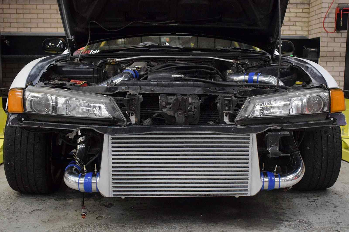 Fitting a front mount intercooler is an excellent way of safely increasing your engine’s power output. This is as a result of reducing the temperature of the air entering the engine, creating a denser charge. The standard Nissan intercooler is a small unit mounted behind the passenger-side wing. Replacing the OEM intercooler with a much larger, front mounted item means that much more cooling is on offer for the hot air trying to enter the engine. The cooler the air, the more power you will have on tap.