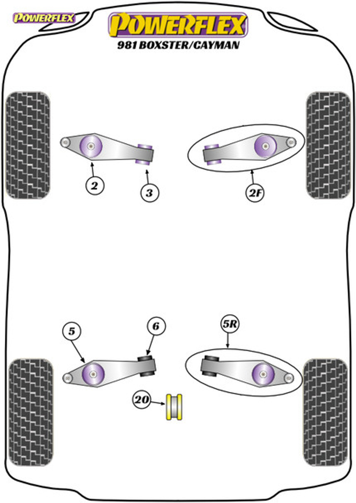 PRODUCT NOTES: PFR57-820 fits all models from 2009 onwards. For any models before this, please use PFR57-520. With impeccably balanced handling, the Porsche 981 & 987.2 Boxster/Cayman inc R are bags of fun to drive, with them rated as being one of the most rewarding sports cars money can buy.However, according to specialists and those in the know, suspension problems are the second most common reason for a 981/987.2 to fail its MOT and the same fatigue seen in the rubber suspension bushes, can be seen in the engine mountings.Prolonged and repetitive strain translated through the engine mountingin combination with the large voiding in the OE bush, results in accelerated ageing of the rubber, with bush failures often seen from around 50,000 miles onwards.PFR57-820Front Engine Mount Bushis made from ourYellow 70Adurometer material and supplied with an anodised outer shell and supporting washers, providing a20% increasein stiffness over the standard rubber, suiting all981/987.2modelsfrom 2009 onwards.A small increase inNVH, usually at idle, should be expected when stiffening the connecting mount between the engine/transmission and chassis. The harder the material used, the greater the NVH transmitted.
