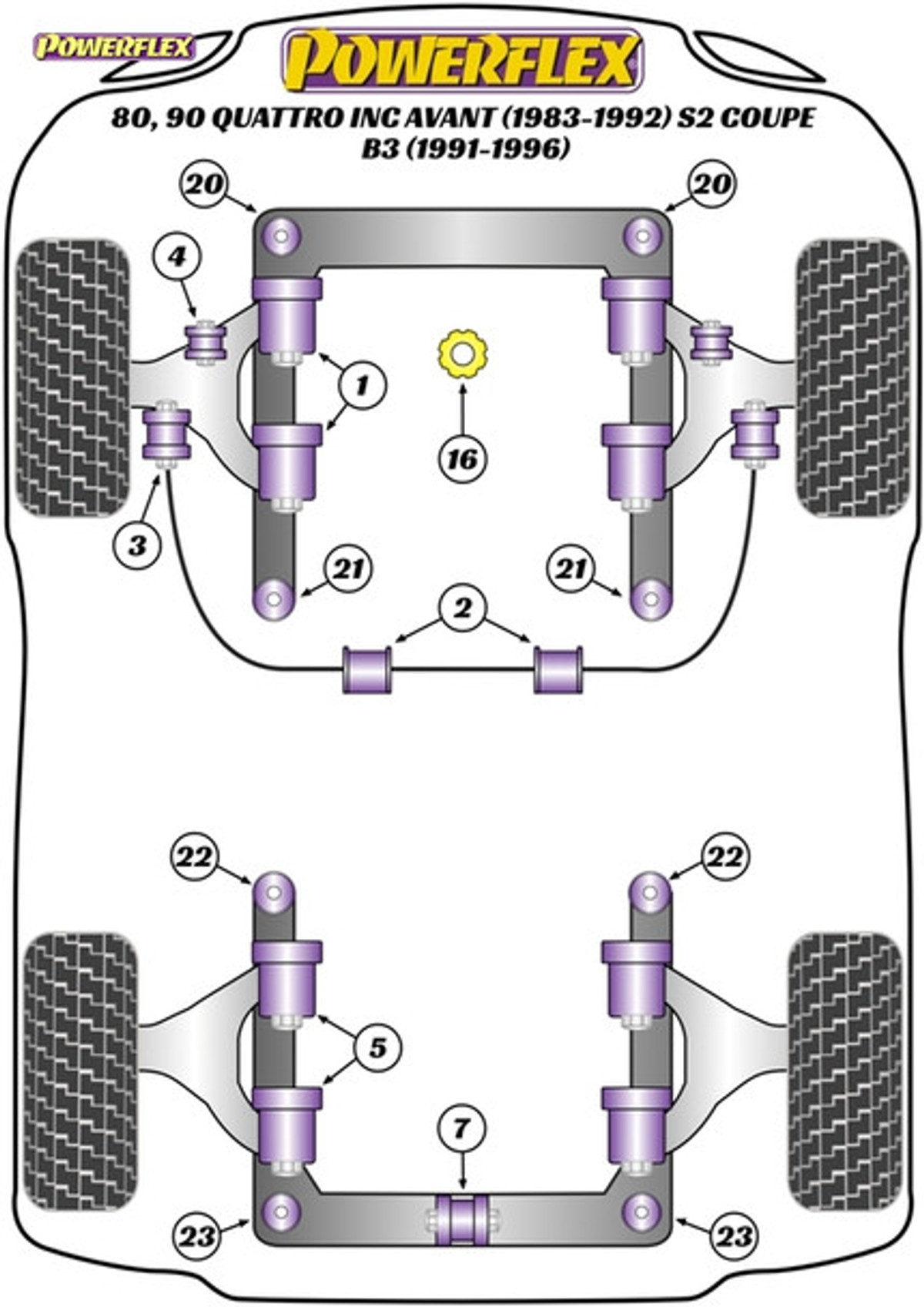 This bush fits Audi 80,90 inc Avant, Coupe, it fits up to 1994 chassis number 8B-L-003-791, after 1991 the anti roll bar may be linked to the shock absorber with a metal link so there will be no anti roll bar link. It fits Audi 80,90 Quattro and Coupe Quattro models up to 1992 Chassis Number 8A-N-200-000. Its fits Audi Cabriolet 1992-2000.